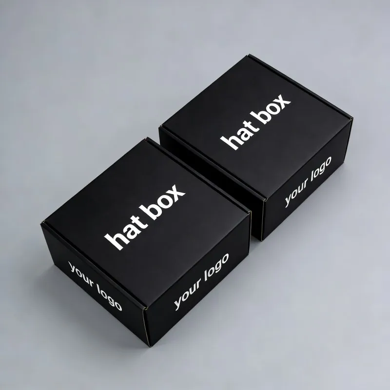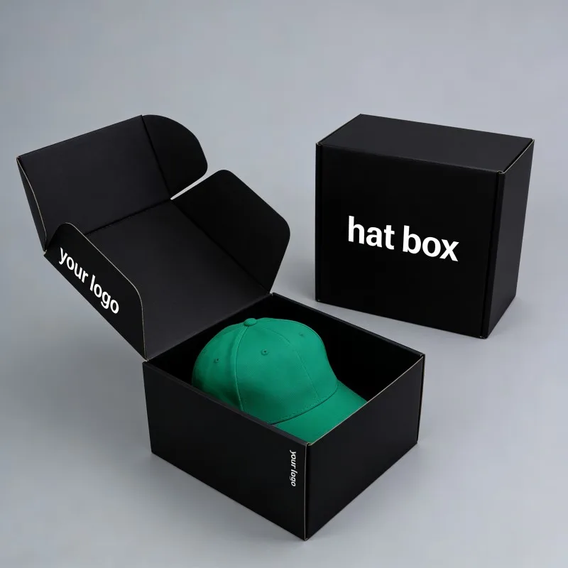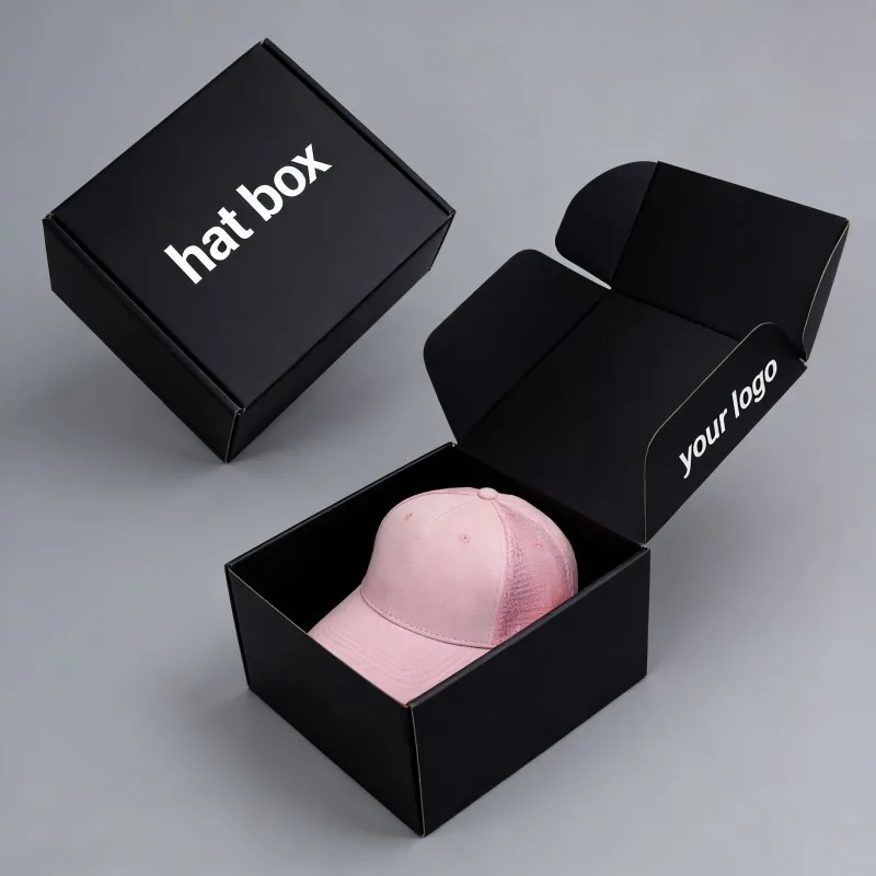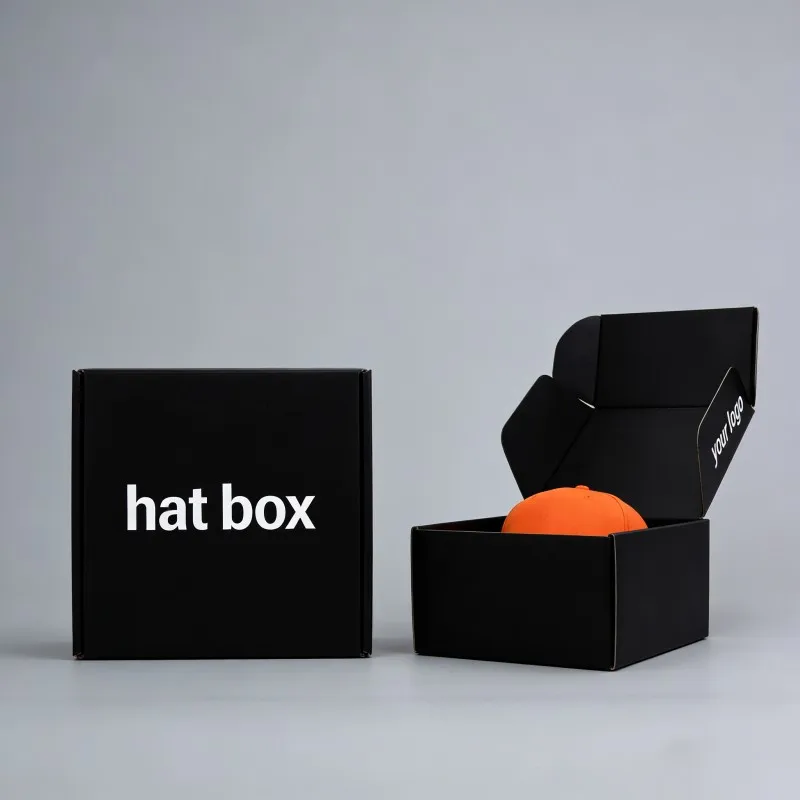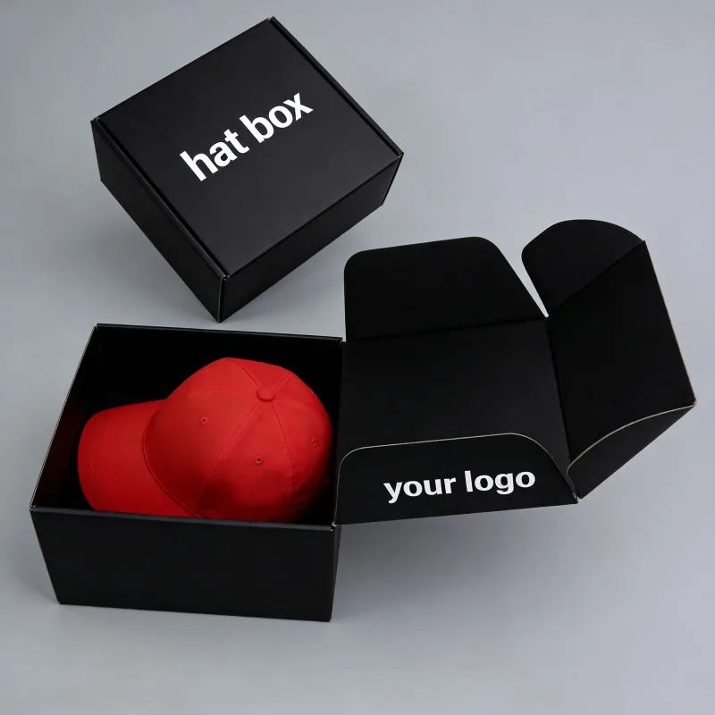 Qara rəngdə çap edilmiş, mat, korqulon şapkalar üçün qablaşdırma qutusu; poçtla göndərilən karton daşınma qutuları; beysbol papaqları, geyim, çorab və geyim məhsulları üçün