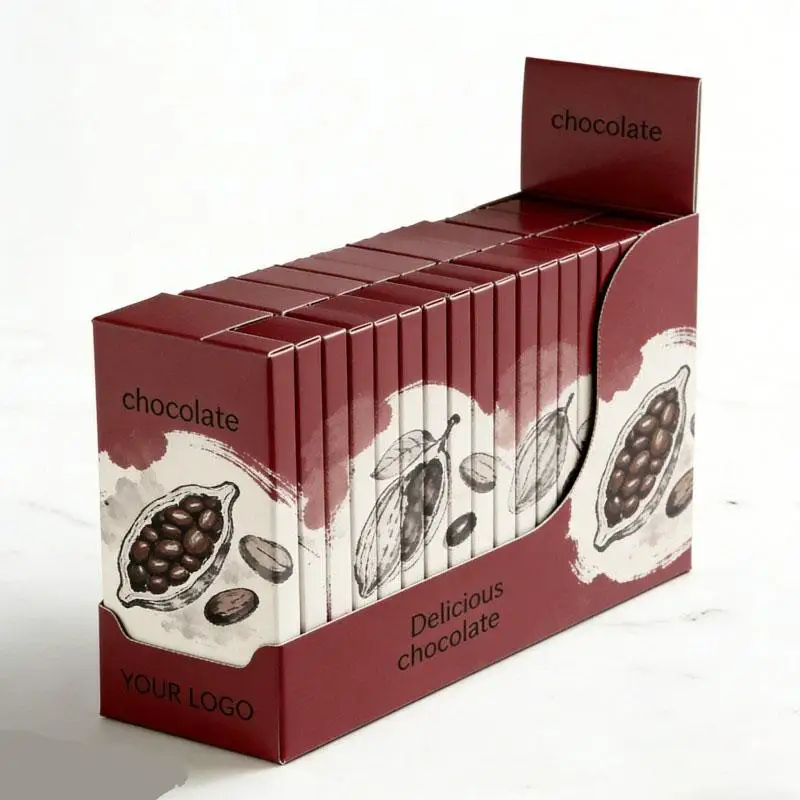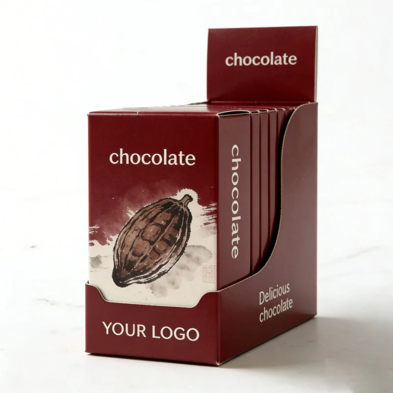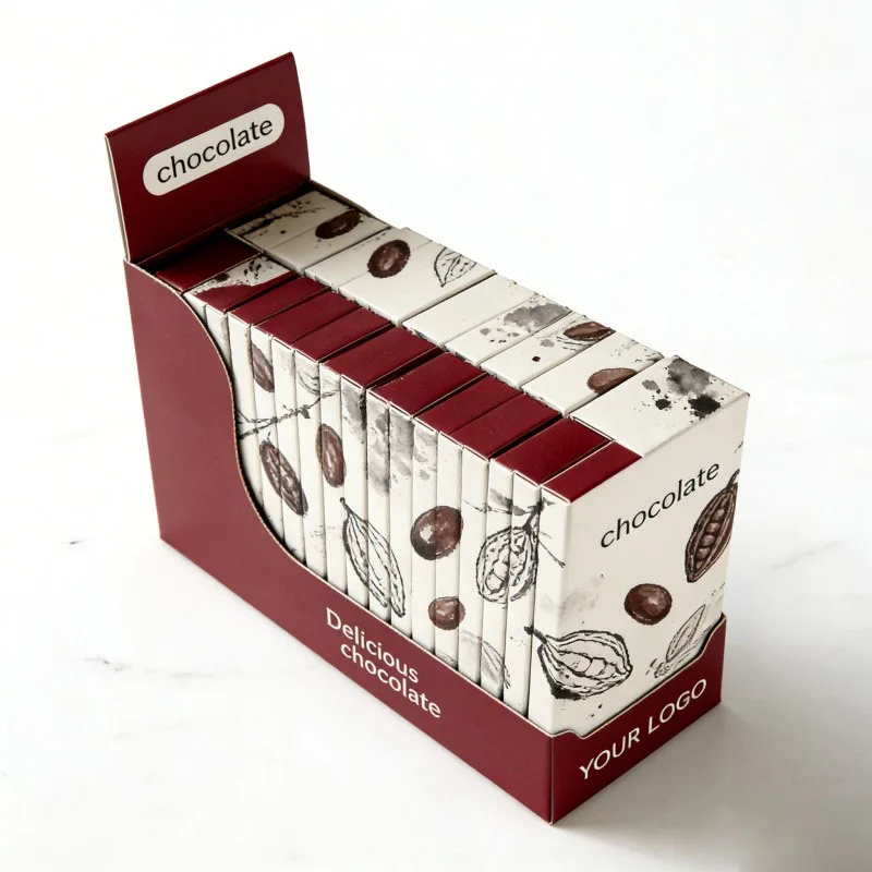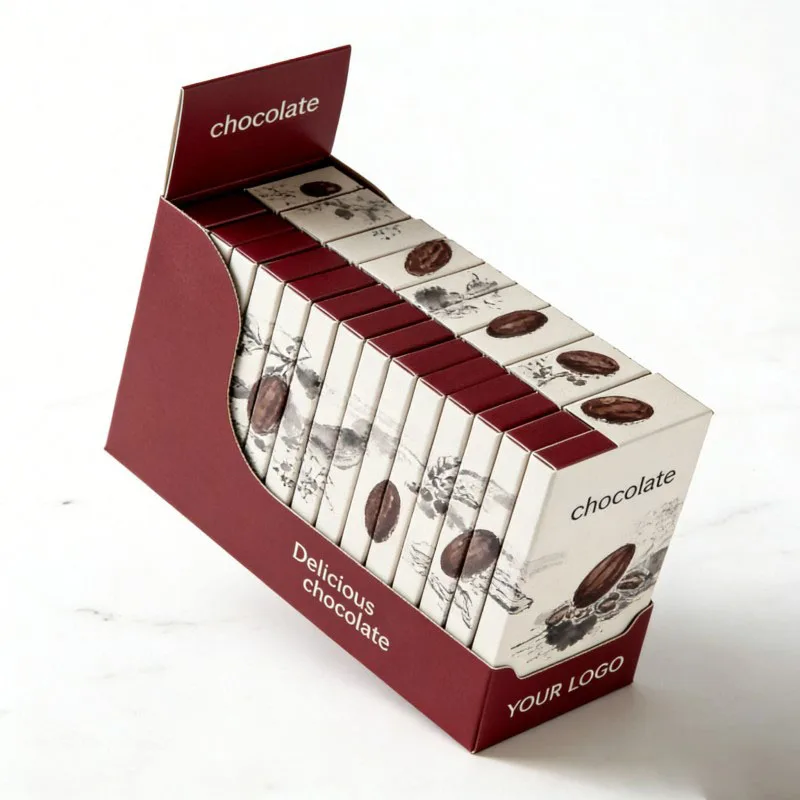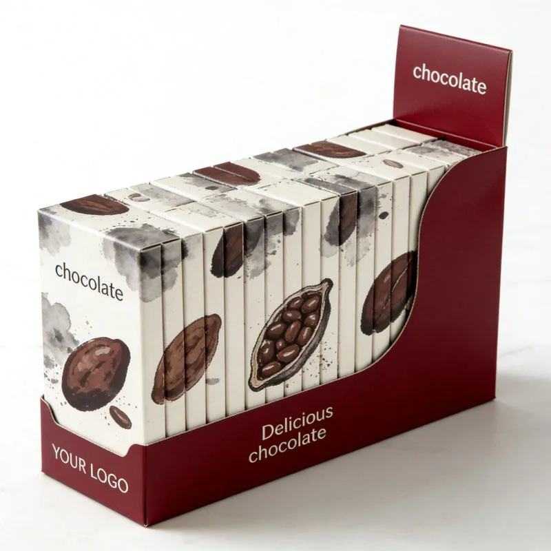 Vlastné tlačené výkladové boxy so stojanom, perforované, s možnosťou odtrhnutia – obalové boxy pre sladkosti, čokoládu a sušienky pre maloobchodné výklady produktov